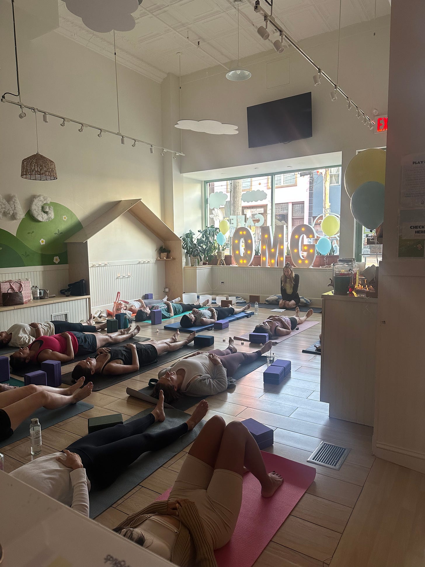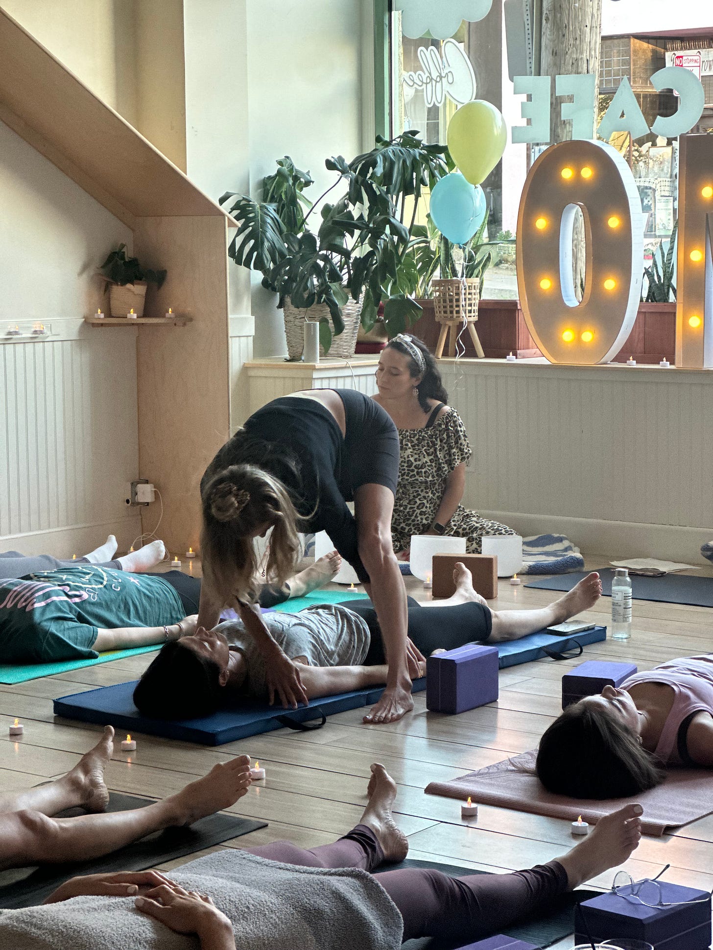 Fortunately (THANK YOU GD!), we planned that while I put the group into shavasana, local healer Elena box would lead a sound bath while I went around and manually adjusted people (my most favorite thing to do)…